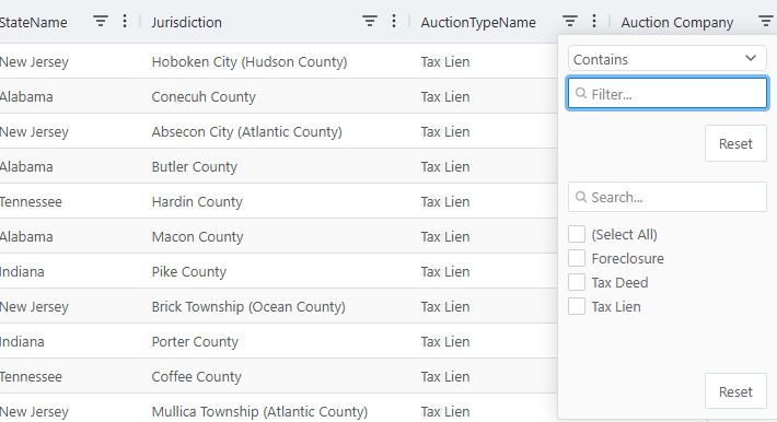 The DigiPan v8 data grid, powered by AG Grid, makes it easy to narrow down tax lien, tax deed, and foreclosure auction data to find exactly what you need. With powerful filtering, you can focus on specific parcels or certificates based on criteria like auction type, location, or minimum bid. Follow these steps to apply filters and streamline your research.